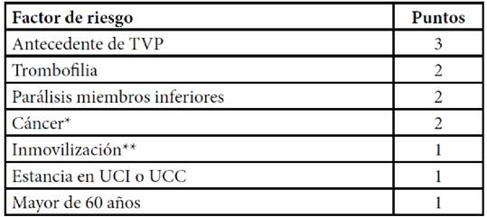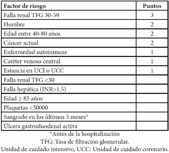 Tabla 1. Puntaje Padua: puntuación entre 1-3, donde el riesgo alto se determina con un puntaje superior a 4
