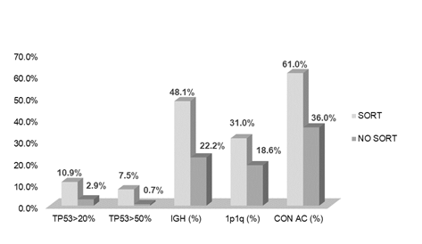 La purificación de células plasmáticas por citometría de flujo permitió mejorar la sensibilidad de detección de alteraciones citogenéticas en general, logrando duplicar (de 36% a 61%) el porcentaje de pacientes con alguna AC. En particular, esas diferencias fueron estadísticamente significativas para la detección de deleciones de TP53 (p=0.004) y rearreglos de IGH (p<0.001).