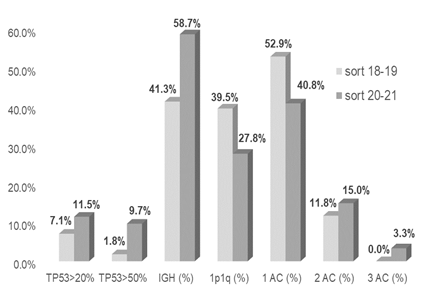 Para el análisis de los resultados con la implementación de la separación celular hemos dividido el tiempo en dos períodos, 2018-2019 y 2020-2021, ya que se utilizaron dos citómetros distintos (FACS Sort Melody (BD) y FACS Aria (BD)). En la segunda etapa se observó un aumento en la sensibilidad de detección de deleciones de TP53 y rearreglos de IGH, y también en la detección de alteraciones combinadas, siendo mayor la cantidad de pacientes con más de 1 AC (2 y 3 AC concomitantes) con respecto al primer período. Contrariamente, las alteraciones del cromosoma 1 se detectaron en mayor porcentaje de pacientes en la primera etapa con respecto a la segunda. Esto se debe probablemente a que en la primera etapa se evaluaron sólo ciertos pacientes que tenían más posibilidades de tener la alteración por sus características clínicas, aumentando así la proporción de pacientes positivos. En la segunda etapa, en cambio, y en base a las evidencias demostradas de su impacto en el pronóstico, las alteraciones del cromosoma 1 fueron incorporadas al estudio de rutina junto a la del17p y a los rearreglos de IGH, alcanzando a mayor número de pacientes y reduciendo el porcentaje de pacientes positivos.