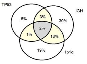 Las AC tienen un impacto directo sobre el pronóstico y las decisiones terapéuticas, y pueden dividirse en primarias y secundarias. Las AC primarias comprenden la hiperdiploidía (HD), es decir trisomías de algunos cromosomas impares, y las translocaciones que involucran al gen de la cadena pesada de inmunoglobulina (IGH) en 14q32. De las trisomías posibles, sólo tres han demostrado modular el riesgo: la trisomía de los cromosomas 3 y 5 mejoran la sobrevida global en comparación con los MM no hiperdiploides, mientras que la trisomía 21 provoca el efecto contrario. Las AC secundarias incluyen la deleción de 17p (TP53), las aneuploidías del cromosoma 1 (deleciones de 1p y/o ganancias de 1q), las translocaciones del gen MYC y la monosomía del cromosoma 13 o deleción de 13q14. Estas alteraciones secundarias suelen aparecer en subpoblaciones de células plasmáticas y se asocian con menor supervivencia, curso clínico agresivo y presencia de enfermedad extramedular(1). El significado pronóstico de estos subclones depende de su tamaño: para el caso de la deleción de 17p (TP53) algunos autores sostienen que 50-60% sería el punto de corte que afecta realmente como factor de riesgo adverso para los pacientes(2).