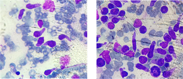 En la CF de MO se informó un 95% de células con inmunofenotipo similar al descripto en SP, mientras que en el medulograma se observó un 92% de células atípicas, de las cuales 78% eran de mediano a gran tamaño, mononucleares, algunos con alta relación núcleo:citoplasma, citoplasma basófilo, núcleo excéntrico, cromatina laxa con presencia de 1 o más nucléolos, algunos con vacuolas, pseudópodos y prolongaciones citoplasmáticas, compatibles con células dendríticas, un 20% presentaba morfología tipo monoblasto y un 2% morfología similar a linfoblastos (Figura 2), con una relación mielo/eritroide en la celularidad remanente igual a 1. El cariotipo fue 46, XY.