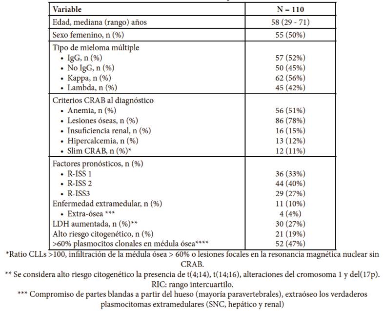 Participaron en el estudio 13 centros de la República Argentina con un total de 110 pacientes incluidos en el estudio. La mediana de edad fue de 58 años (rango 29-71) con 50% de sujetos femeninos. 29 pacientes (27%) presentaron R-ISS 3, 21 pacientes (19%) alto riesgo citogenético y 11 pacientes (10%) enfermedad extramedular. La mediana de seguimiento para nuestra cohorte fue de 17 meses (rango 7-52). Las características de la población del estudio se encuentran detalladas en la Tabla 1.