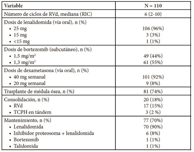 La mediana de ciclos de inducción con RVd administrados fue de 6 (rango 2-10). La dosis de lenalidomida fue de 25 mg diarios por 21 días cada ciclo, en el 96% (106) de los pacientes. El bortezomib fue administrado en forma subcutánea y semanal en todos los pacientes a una dosis de 1,3 mg/m2 en el 55% (61) de los pacientes. Al momento del análisis 74% (81) de los pacientes habían recibido TCPH y el 70% (77) de los pacientes se encontraban en fase de mantenimiento. En nuestra cohorte 18% (20) de los pacientes recibieron tratamiento de consolidación post TCPH, 17 pacientes RVd y 3 pacientes TCPH en tándem. El detalle de los tratamientos recibidos se describe en la tabla 2.