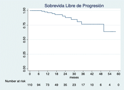 Con una mediana de seguimiento de 17 meses, la mediana de sobrevida libre de progresión no ha sido alcanzada aún. La SLP fue de 88% a 2 años (IC95% 75-94) (Figura 1).