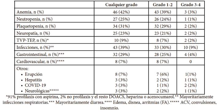 Los eventos adversos (cualquier grado) más comunes fueron: anemia (42%), neutropenia (25%), trombocitopenia (31%), infecciones (39%), alteraciones gastrointestinales (29%) y neuropatía (23%). La mayoría de ellos fueron de grado 1 o 2; las principales toxicidades grado 3 o mayor fueron: infecciones (9%), alteraciones gastrointestinales (4%) y anemia (3%). La tabla 5 detalla los eventos adversos de nuestra cohorte.