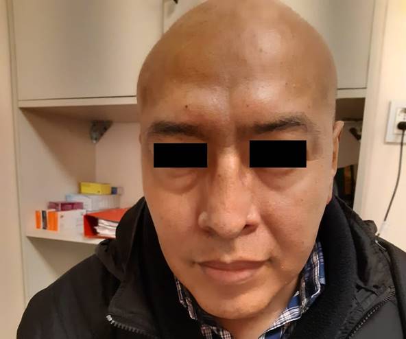 Paciente de 44 años. En julio de 2021 consultó por lesión en fosa nasal izquierda, dolorosa y sangrante, que dificultaba la respiración y se extendía a la piel de la nariz (Figura 1). Se realizó rinoscopia con biopsia de cornete, cuyo resultado reveló un linfoma de células T/NK nasal, siendo su inmunohistoquímica: