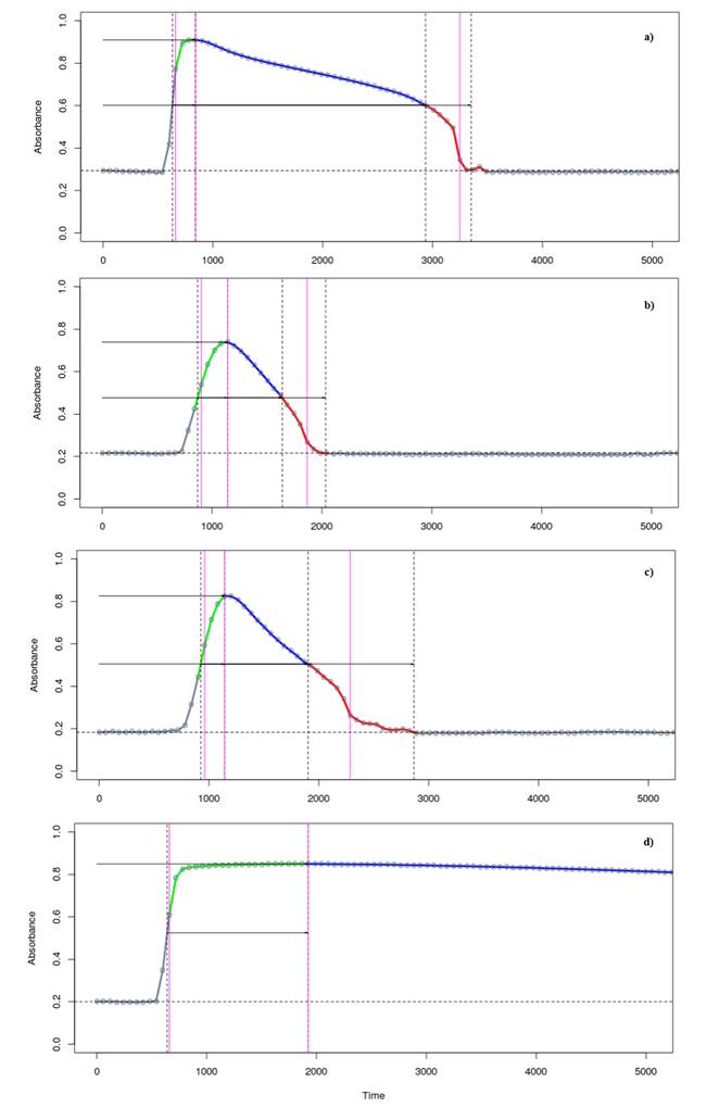 Obtener los datos en una planilla en una hoja de cálculo, graficar las curvas (tiempo contra absorbancia) y calcular los siguientes datos de cada pocillo como el gráfico de ejemplo (Figura 2).