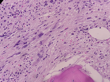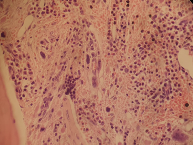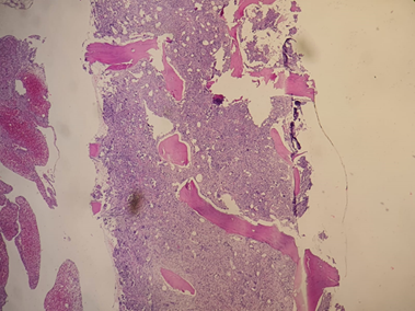 Figura 2. Biopsia de MO en 10x con celularidad poco evaluable por fibrosis. Se observa fibrosis con HyE probable MF3.