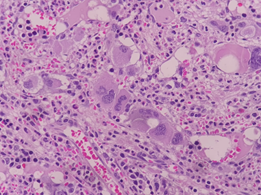 Figura 4. Biopsia de MO en 100x. En zonas de mayor celularidad se observa serie megacariocítica con aumento numérico relativo y absoluto, con marcados rasgos dismórficos y atipia celular con grupos alineados y distribución universal. Cambios estromales marcados con fibrosis, neovascularización, dilatación sinusoidal e histiocitos con hemosiderina. El tejido óseo presenta depósitos osteoides y aumento de actividad osteoblástica.