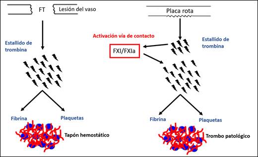 La trombosis generada por una rotura de la pared del vaso expone el factor tisular (FT), esto desencadena un estallido de trombina local suficiente para formar un trombo hemostático efectivo que normalmente se autolimita sin requerir amplificación. En las trombosis patológicas, el FXI es activado por la trombina resultante de la vía del FT y medía la fase de amplificación necesaria para el estallido de trombina y el crecimiento del trombo dentro del vaso (Figura 1)(6).