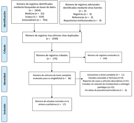 Esta revisión sistemática incluyó artículos actualizados sobre patologías asociadas a la manifestación de trombocitosis. La estrategia de búsqueda, bases de datos consultadas y criterios de selección se muestran a continuación: