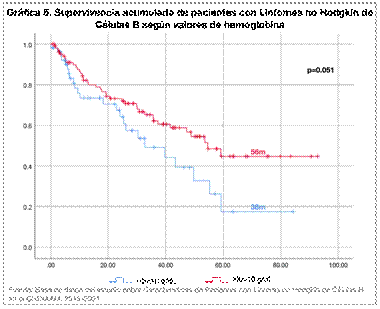 Las figuras 4, 5 y 6 muestran la sobrevida acumulada de pacientes con LNH según diversos criterios. Pacientes con valores de lactato deshidrogenasa (LDH) >500 U/L tuvieron una sobrevida acumulada de 56 meses vs 36 meses de aquéllos con valores < 500 U/L (p<0.05). De igual forma fue estadísticamente significativa (p<0.05), la diferencia de sobrevida global en aquellos pacientes con síntomas B al momento del debut de la enfermedad (43 meses) vs 63 meses de aquéllos que no tenían estos síntomas en la presentación inicial. La anemia fue otro de los factores estudiados en relación a sobrevida global. Pacientes con Hb > 10 g/dL tuvieron una sobrevida global de 56 meses vs 38 meses de aquellos pacientes con Hb <10 g/dL (p=0.051).