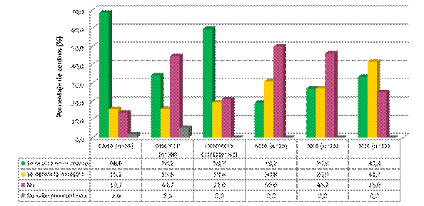 En la tabla 3 se muestra la proporción de centros con disponibilidad de los distintos factores de la coagulación. El 52% de los centros del país relevados no tenían disponible para sus pacientes la determinación de factor XIII (por realización en el centro o derivación). El 9% de los centros reportaron que realizaban la medición de todos los factores, y el porcentaje ascendía a 39% cuando también se contemplaba la derivación.