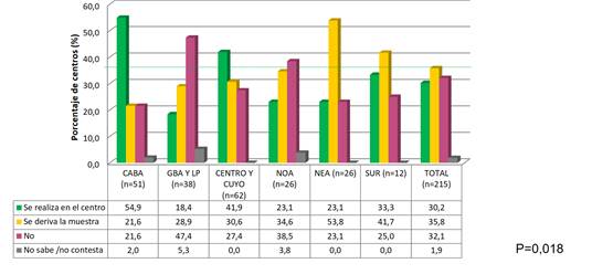 En un mayor porcentaje de centros públicos se desempeñaban bioquímicos especialistas (70% vs 53%, p=NS), aunque la diferencia no fue estadísticamente significativa. La región con menor porcentaje de centros con especialistas fue GBA/LP (37%)
