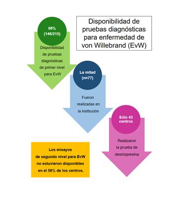 Se evaluó la disponibilidad de la prueba de la desmopresina en los centros con atención de pacientes (n=204, se excluyeron los laboratorios). El 22% reportaron que realizaban la prueba en su centro, en 27,5% que derivaban el paciente a otra institución, mientras que un 47% no tenía capacidad de ofrecer el estudio a sus pacientes (un 3,5% de los encuestados no reportaron información). Un alto porcentaje de los centros (42%) que realizaban estudios de 1er nivel de EvW no efectuaban pruebas de la desmopresina (Figura 7).