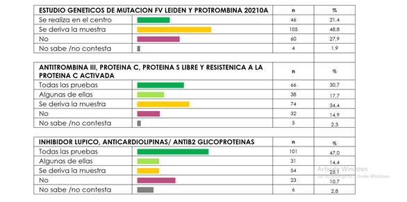 Se detectó una amplia disponibilidad de las pruebas básicas de la hemostasia: TP-APTT-RIN (96,5%), recuento de plaquetas por contador automatizado (96%) y corrección de APTT con plasma normal (88,5%). Un alto porcentaje de centros realizaban la determinación de fibrinógeno por Clauss (80%) o derivaban la muestra con resultado en menos de 48 horas (9%). Respecto al tiempo de trombina (TT), el 72% de los centros reportaron que lo realizaban, el 14% derivaba la muestra (con resultado antes de las 48 horas) y el 14% no disponía de la prueba.