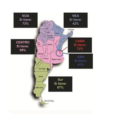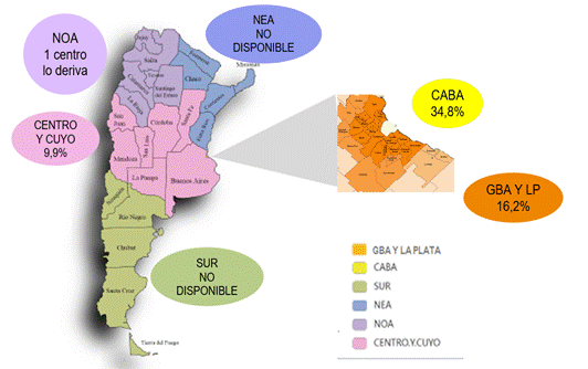 - Centro y Cuyo: resto de la provincia de Buenos Aires, Córdoba, Santa Fe, La Pampa, Mendoza, San Luis y San Juan
