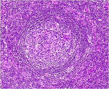 Biopsia de ganglio axilar derecho. Corte histológico teñido con hematoxilina eosina (40x). Se observa un folículo linfoide con centro germinal atrófico e hiperplasia de la zona del manto con linfocitos dispuestos en capas concéntricas. |