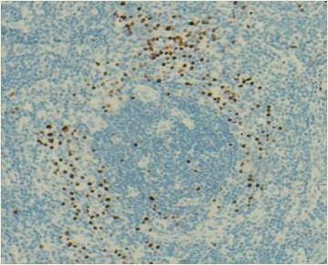 Biopsia de ganglio axilar derecho. Inmunomarcación para LANA-1 (40x). Se observa positividad en células de la zona del manto. |