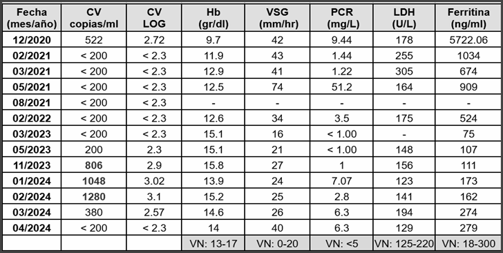 Durante el período comprendido entre diciembre 2020 y abril 2024, se realizó el seguimiento con carga viral (CV) de VHH8 plasmática por PCR en tiempo real (TIB MOLBIOL-Roche) y parámetros inflamatorios como eritrosedimentación (VSG), proteína C reactiva (PCR), hemoglobina (Hb), lactato deshidrogenasa (LDH) y ferritina (Tabla 1).