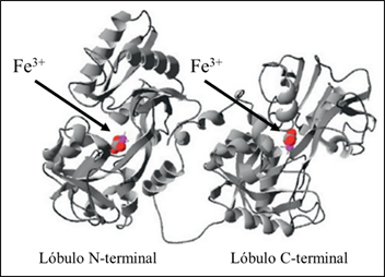 Figura 1. Estructura de la transferrina sérica. Compuesta por dos lóbulos, N-terminal y C-terminal, unidos por un péptido corto. Las flechas indican el sitio de unión del Fe3+.
