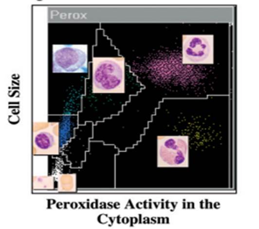 Para determinar la actividad de dicha enzima se lisan los glóbulos rojos y se utilizan reactivos específicos para distinguir entre células positivas para la peroxidasa (neutrófilos, eosinófilos y monocitos) y células negativas que incluyen linfocitos, basófilos y "células grandes no teñidas” (LUC). Para determinar la absorbancia y el tamaño se utiliza un sistema óptico basado en tungsteno. Las células absorben luz en proporción a la cantidad de peroxidasa presente, y este parámetro se relaciona con la actividad de peroxidasa representado en el eje "x" del scatter de peroxidasa. Por otro lado las células dispersan la luz en proporción a su tamaño, y este parámetro está representado en el eje "y" del gráfico (Figura 1).