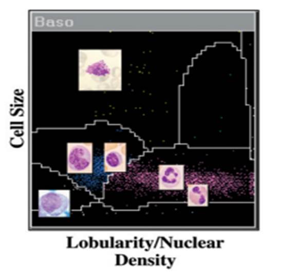 Por otro lado el canal de densidad nuclear, también llamado canal de basófilos, es el principal utilizado para informar el recuento de leucocitos. En este canal se lisan los glóbulos rojos y las plaquetas, además de eliminar la membrana plasmática de los leucocitos, excepto de los basófilos. Posteriormente se realiza un recuento de células y se clasifican de acuerdo a su tamaño, lobularidad y densidad nuclear. Este canal proporciona información valiosa respecto a la maduración nuclear debido a su lobularidad y densidad. (Figura 2).