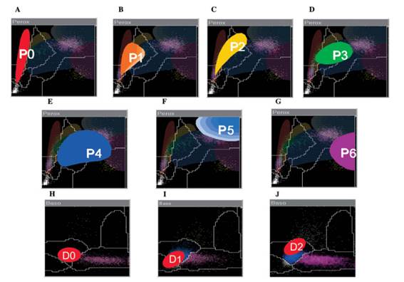 Figura 3. Patrones formados de acuerdo a la actividad de peroxidasa (P0 a P6) y densidad nuclear (D0 a D2)