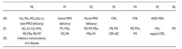 De esta manera se pueden destacar algunos patrones característicos como, por ejemplo, el P6 que está asociado a una leucemia promielocítica aguda (M3) debido a la gran actividad de MPO que presentan estas células.